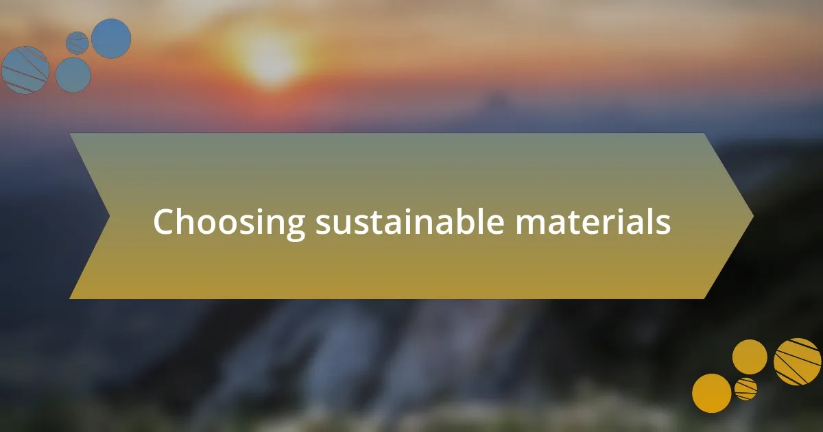 When it comes to choosing sustainable materials, I’ve learned that every little decision matters. For instance, when renovating my home, I opted for bamboo flooring instead of traditional hardwood. Not only is bamboo a rapidly renewable resource, but walking on it also gives my space a warm, natural feel that I adore. Have you ever considered how your material choices impact the environment?